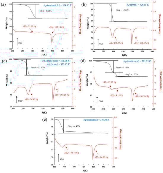 TGA and DSC curves of solvates of AXTN: (a) AXTN-acetonitrile solvate (S1); (b) AXTN-DMF solvate (S2); (c) AXTN-acetic acid-H2O solvate (S3–1); (d) AXTN-acetic acid solvate (S3–2); (e) AXTN-methanol solvate (S4). The heat values represented by the endothermic peak are marked with arrows.
