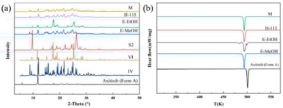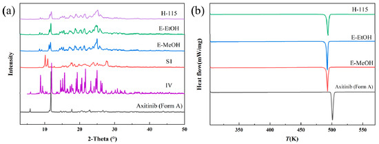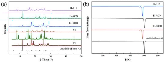 The solvate of AXTN-acetonitrile converted to the new crystal form Z through ethanol-mediated phase transformation. The PXRD pattern of the product showed the appearance of several distinct new peaks (2θ = 19.45°, 23.00°, 25.29°, and so on) (Figure 8a). It can be seen from the DSC curve that the form Z undergoes a polymorph transformation at 490 K (accompanied by the appearance of an endothermic peak), possibly transforming into crystalline form A. In the DSC curve, the second endothermic peak of the product is consistent with that of the raw material (Figure 8b). The TGA curve of form Z is presented in the Supplementary Materials (Figure S6).