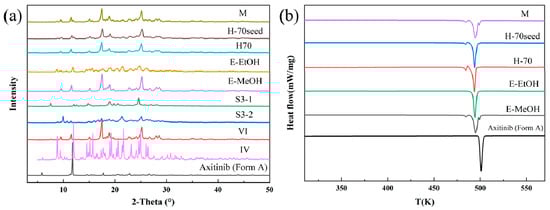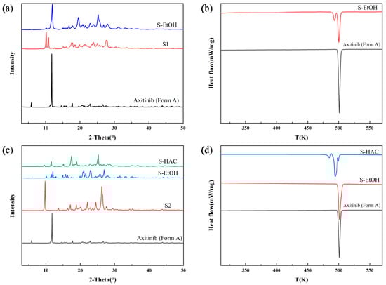 After SMPT experiments on AXTN-DMF solvates, two crystal forms can be obtained: crystal form A (formed through ethanol-mediated transformation) and crystal form IV (formed through acetic-acid-mediated transformation). Based on PXRD (Figure 8c) and DSC (Figure 8d) analyses, there also exists some form A in the products.