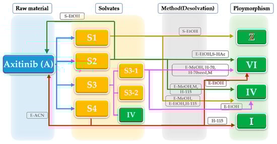 In summary, the AXTN (form A) can form solvates with acetonitrile, DMF, acetic acid, and methanol. When AXTN is mixed with acetic acid, different ratios of solute and solvent will yield different solid forms. Solid characterization indicates that these solvates can transform into other crystal forms after desolvation. The relationship between the transformation methods and corresponding crystal forms of AXTN is illustrated in Figure 9.