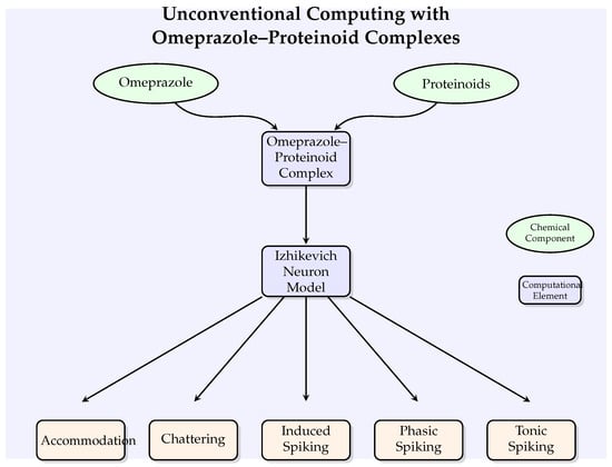 Figure 2 illustrates the conceptual framework of our unconventional computing approach, showing how omeprazole–proteinoid complexes interact with the Izhikevich neuron model to potentially modulate various neuronal behaviours.