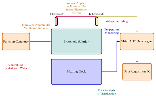 Diagram illustrating the setup used for the electrochemical characterisation of the proteinoid solution, with and without omeprazole. The solution is contained within the central container, equipped with two needle electrodes coated with platinum (Pt) and iridium (Ir), respectively, positioned 10 mm apart. A high-precision 24-bit ADC data recorder captures voltage responses between these electrodes. A heating block regulates temperature. A function generator produces stimuli that simulate neuron-like membrane potential changes, applied between the electrodes. This setup allows for the identification of very small voltage changes (in the microvolts range) and the analysis of the spatial and temporal patterns of voltage responses in the proteinoid solution. Control experiments are conducted using the same setup with different chemicals to isolate the specific effects of omeprazole.