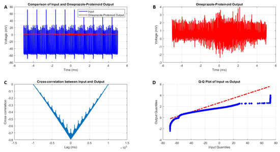 where represents the input signal values and represents the output signal values. The maximum difference between the input and output signals was 75.71 mV, occurring at ms, further highlighting the significant signal transformation by the omeprazole–proteinoid sample. Lag analysis revealed a time difference of ms between the input and output signals, indicating a substantial phase shift in the response of the omeprazole–proteinoid sample. To assess the statistical similarity between the input and output signal distributions, a Kolmogorov–Smirnov test was performed. The test yielded a test statistic of with a p-value < 0.0001, resulting in the rejection of the null hypothesis. This confirms that the input and output signals follow significantly different distributions, as visually represented in the Q-Q plot in Figure 5d. The Kolmogorov–Smirnov test statistic is defined as: