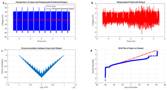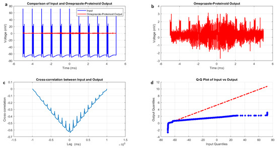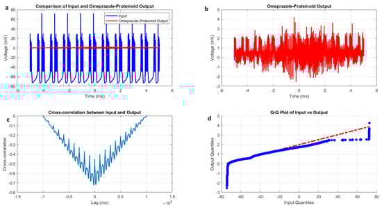 Characterisation of phasic spiking dynamics in omeprazole–proteinoid complexes. (a) Input–output comparison: Input signal (mean: mV, SD: 8.23 mV) and omeprazole–proteinoid output (mean: 0.54 mV, SD: 0.33 mV). Correlation coefficient: 0.4503, RMSE: 55.9366 mV. (b) Detailed output plot illustrating the response characteristics of the omeprazole–proteinoid complex (range: mV to 3.17 mV). (c) Cross-correlation analysis revealing a time lag of ms between input and output signals. Maximum difference: 67.00 mV at 2.00 ms. (d) Q-Q plot comparing input and output distributions (Kolmogorov–Smirnov test: KS statistic = 0.9945, p < 0.0001), demonstrating significantly different signal distributions and non-linear response properties.