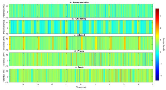 We detected considerable signal attenuation and change in all spiking modes, including accommodation, chattering, induced, phasic, and tonic. Nevertheless, the extent and characteristics of this change differed significantly among different modes: