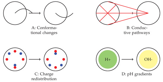 The complex behaviours observed in various spiking modes are presumably the result of a combination of molecular-level mechanisms within the omeprazole–proteinoid complexes. Figure 10 depicts many suggested mechanisms that could potentially contribute to the observed signal-processing capabilities. These factors include changes in the proteinoid structure that are sensitive to voltage (Figure 10A), which could explain the different responses depending on the mode; the creation and breakdown of temporary pathways for conducting signals (Figure 10B), which may account for the non-linear transformation of the signal; processes of accumulating and redistributing charges (Figure 10C), which could explain the observed delays and anticipatory behaviours; and the interaction between omeprazole’s inhibition of proton pumps and local differences in pH (Figure 10D), which may contribute to the consistent normalisation of the signal across all modes. The interaction between these mechanisms could elucidate the diverse and flexible behaviour of the omeprazole–proteinoid system under different patterns of stimulation. Additional research into these processes at the molecular level will be essential for gaining a complete understanding and perhaps utilising these capabilities in molecular computing [38] and smart drug delivery systems [39].