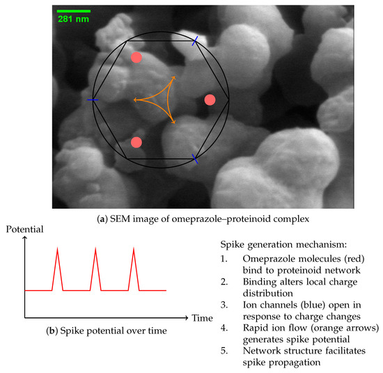 The study of the omeprazole–proteinoid complex unveils a complex mechanism [40] for spike emergence, as depicted in Figure 11. The scanning electron microscope (SEM) image (Figure 11a) depicts a complex network structure that serves as the foundation for the observed electrical behaviour. Our hypothesis suggests that the process of spike formation consists of a sequence of stages, starting with the attachment of omeprazole molecules to the proteinoid network (Figure 11a). The occurrence of this binding event can be mathematically represented by Equation [10]: