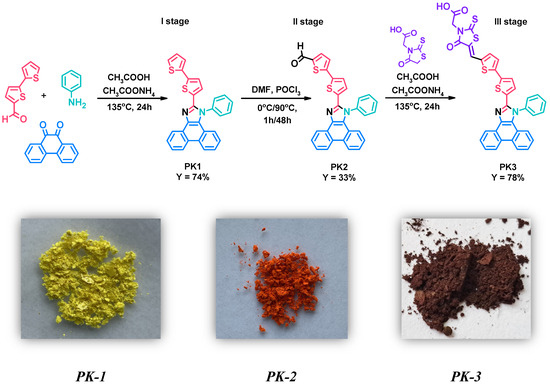 Research in this work began with the synthesis of 2-(2,2′-bithiophen-5-yl)-1-phenyl-1H-phenanthro[9,10-d]-imidazole (PK1)—first stage. This compound was obtained in the Debus–Radziszewski reaction between 2,2′-bithiophene-5-carboxaldehyde, aniline, phenanthrenequinone, and ammonium acetate (Figure 1—I stage). Acetic acid was used as the reaction medium. For this type of reaction, heating the reaction mixture at reflux temperature has proven highly advantageous. The crude product was precipitated, filtered, and washed thoroughly with distilled water. Finally, PK1 was purified by column chromatography. The yield of the reaction was 74%. The detailed procedure for synthesizing PK1 was also described in our previous studies aimed at searching for new emitters for OLEDs [28]. Then, in the second stage, the obtained 2-(2,2′-bithiophen-5-yl)-1-phenyl-1H-phenanthro[9,10-d]-imidazole (PK1) was subjected to a formylation reaction using phosphorus(V) oxychloride (POCl3) and N,N-dimethylformamide (DMF) (Figure 1—II stage). POCl3 was added slowly (drops) to the reaction mixture at a temperature of 0 °C. After one hour, the temperature of the reaction mixture was gradually raised to 90 °C. This temperature was then maintained for two days. Interestingly, DMF acted as a solvent and reagent in this reaction. After heating, the crude product was precipitated, filtered, washed thoroughly with distilled water and purified by column chromatography. Thanks to the procedure used, 5′-(1-phenyl-1H-phenanthro[9,10-d]imidazol-2-yl)-2,2′-bithiophene-5-carbaldehyde (PK2) was obtained with a yield of 33%. A significant advantage of the presented method compared to coupling reactions used to synthesize structurally similar compounds is its simplicity and lower price due to the lack of an expensive catalytic system [29]. The third step consisted of the Knoevenagel condensation of the previously obtained PK2 with rhodanine-3-acetic acid in the presence of acetic acid as a solvent (Figure 1—III stage). This reaction was carried out at the boiling temperature of the reaction mixture. After completing the synthesis of 2-[5-((5′-(1-phenyl-1H-phenanthro[9,10-d]imidazol-2-yl)-2,2′-bithiophene-5-yl)methylene)-4-oxo-2-thioxo-thiazolidin-3-yl]acetic acid (PK3), it was filtered, washed thoroughly with distilled water, and dried. Interestingly, PK3 did not require additional purification methods. The yield of the reaction was 78%. The structure of the obtained compounds (PK1–PK3) was confirmed by NMR spectroscopy (1H and 13C). The necessary NMR spectra can be seen in the SI (Figures S1–S6).