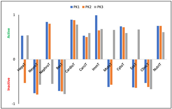 The tested molecules are characterized by a relatively high LogP value: 7.19, 8.12, and 8.53 (±0.25) for PK1, PK2, and PK3, respectively. Since these values exceed five, they suggest, in accordance with Lipinski’s [41,42] rule of five, that the penetration of these derivatives through cell membranes may be impeded, potentially reducing their ability to bind to enzymes or receptors at their site of action. A substance is considered to be not bioaccumulative if it has a BCF less than 1, bioaccumulative if it has a BCF from 1 to 5 and very bioaccumulative if it has a BCF greater than 5. The calculated LogBCF values (PK1 = 1.79, PK2 = 1.04, PK3 = −0.08) suggest that only PK3 should be considered as a molecule with no bioaccumulation potential, as it is readily excreted from living organisms via urine. In contrast, the slightly elevated values for PK1 and PK2 imply a possible affinity for lipids, indicating these compounds may preferentially concentrate in lipid-rich tissues rather than in aqueous environments like the cytosol. The PK1 derivative is characterized by relatively intermediate metabolism by CYP450-2D6 (probability (P) is 56%) and CYP450-3A4 ( 55%). The introduction of an aldehyde group into its structure results in the cessation of metabolism via the first cytochrome with a probability of 54%. At the same time, the probability of metabolism by the second cytochrome increases to 77%. The third of the analyzed derivatives does not show any tendency to be metabolized by these cytochromes and in both cases = 79%. PK1 and PK2 also show a high tendency to be metabolized by CYP450-1A2 ( 85%, 81%) and CYP450-2C19 ( 74%, 75%). In turn, PK3 will not be metabolized by these cytochromes with a probability of 83% and 78%, respectively. Therefore, only PK1 and PK2 derivatives will be satisfactorily removed from tissues and the human body without interacting with other biomolecules and drugs. The theoretically determined oral toxicity LD50 values are 497.80 mg/kg, 1055.00 mg/kg, and 143.20 mg/kg for PK1, PK2, and PK3, respectively. Therefore, these values indicate the need for caution when using PK3, and that the introduction of the –COH group into the system reduces the toxicity of the system by more than two times. For intraperitoneal route of administration, LD50 values are 335.10 mg/kg, 457.10 mg/kg, and 738.50 mg/kg; for intravenous route of administration LD50 values are 60.39 mg/kg, 40.05 mg/kg, and 169.30 mg/kg; for subcutaneous route of administration, LD50 values are 238.70 mg/kg, 981.30, and 1602.00 mg/kg. Moreover, all derivatives show no neurotoxicity, respiratory toxicity, and clinical toxicity (Figure 4). Only PK2 shows no hepatotoxicity. Nephrotoxicity does not show for PK3, and mutagenicity does not show for PK2 and PK3. In turn, all molecules show a relatively high probability of cardiotoxicity, carcinogenicity, immunotoxicity, and cytotoxicity. Moreover, the tested derivatives show many more biological activities (Table S8), proving the possibility of their use as pharmacologically active substances.