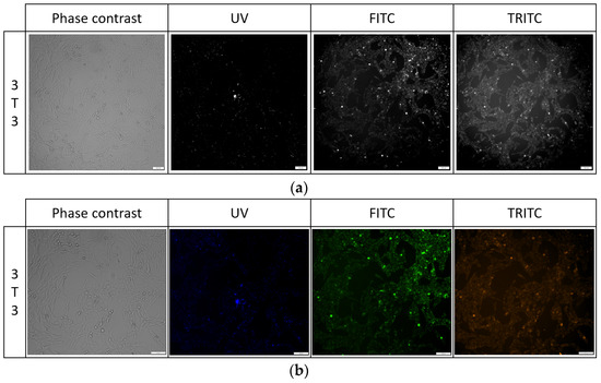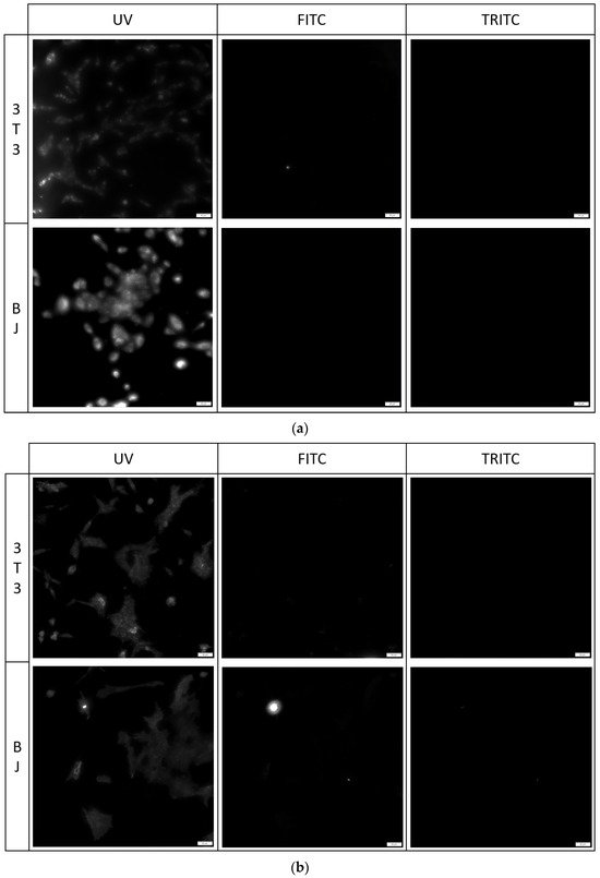 3T3 and BJ cells after 24-hour incubation with 1 μg/mL PK1 fixed with (a) 4% formaldehyde or (b) 96% ethanol. Cells were simultaneously imaged in three different channels (UV, FITC, TRITC). All cells in the UV channel were stained.