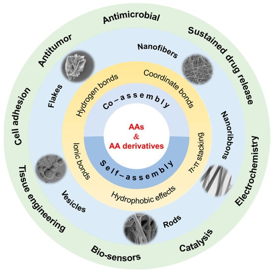 - Wang, T.; Ménard-Moyon, C.; Bianco, A. Self-Assembly of Amphiphilic Amino Acid Derivatives for Biomedical Applications. Chem. Soc. Rev. 2022, 51, 3535–3560. [Google Scholar] [CrossRef]