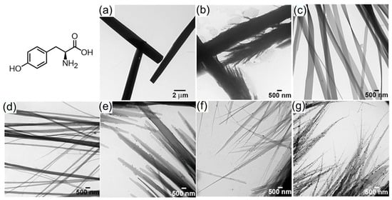 - Ménard-Moyon, C.; Venkatesh, V.; Krishna, K.V.; Bonachera, F.; Verma, S.; Bianco, A. Self-Assembly of Tyrosine into Controlled Supramolecular Nanostructures. Chem. Eur. J. 2015, 21, 11681–11686. [Google Scholar] [CrossRef]
