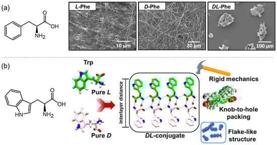 - Bera, S.; Xue, B.; Rehak, P.; Jacoby, G.; Ji, W.; Shimon, L.J.W.; Beck, R.; Král, P.; Cao, Y.; Gazit, E. Self-Assembly of Aromatic Amino Acid Enantiomers into Supramolecular Materials of High Rigidity. ACS Nano 2020, 14, 1694–1706. [Google Scholar] [CrossRef] [PubMed]