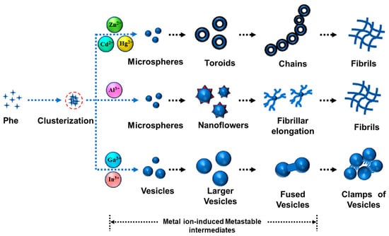 - Bagchi, D.; Maity, A.; De, S.K.; Chakraborty, A. Metal-Ion-Induced Evolution of Phenylalanine Self-Assembly: Structural Polymorphism of Novel Metastable Intermediates. J. Phys. Chem. Lett. 2022, 13, 10409–10417. [Google Scholar] [CrossRef] [PubMed]