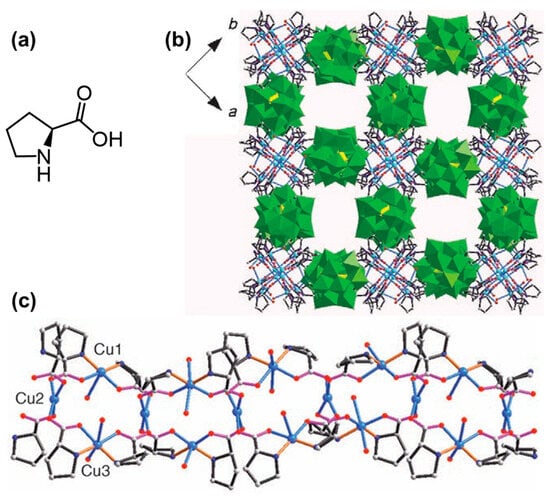 - An, H.; Wang, E.; Xiao, D.; Li, Y.; Su, Z.; Xu, L. Chiral 3D Architectures with Helical Channels Constructed from Polyoxometalate Clusters and Copper–Amino Acid Complexes. Angew. Chem. Int. Ed. 2006, 45, 904–908. [Google Scholar] [CrossRef] [PubMed]