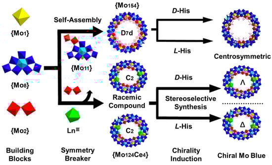 - Xuan, W.; Pow, R.; Watfa, N.; Zheng, Q.; Surman, A.J.; Long, D.-L.; Cronin, L. Stereoselective Assembly of Gigantic Chiral Molybdenum Blue Wheels Using Lanthanide Ions and Amino Acids. J. Am. Chem. Soc. 2019, 141, 1242–1250. [Google Scholar] [CrossRef]