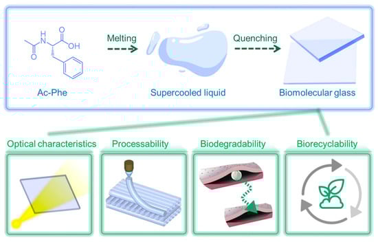 - Xing, R.; Yuan, C.; Fan, W.; Ren, X.; Yan, X. Biomolecular Glass with Amino Acid and Peptide Nanoarchitectonics. Sci. Adv. 2023, 9, eadd8105. [Google Scholar] [CrossRef] [PubMed]