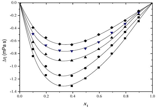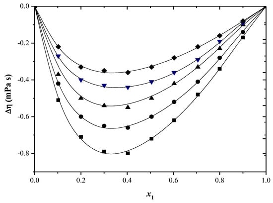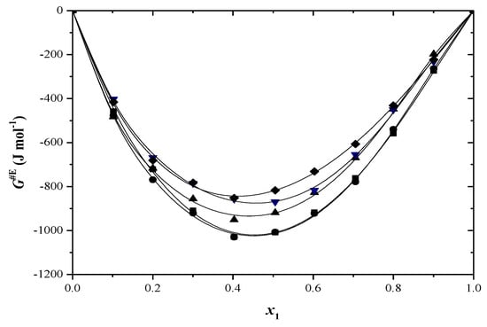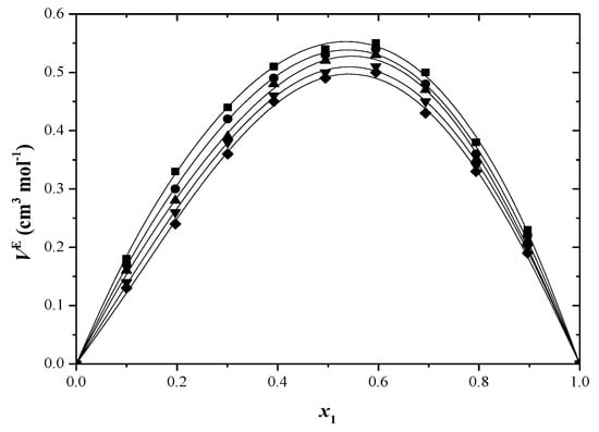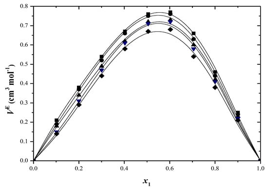 Densities were measured with a digital densimeter (model DA 650 KEM—Kyoto Electronics manufacturing, Tokyo, Japan) at P = 100 kPa. The procedures for measuring the density and viscosity were explained earlier [67]. The uncertainty for the mole fraction of the mixtures was below 3 × 10−4. The combined expanded uncertainty of the densities was calculated to be 0.0006 g·cm−3, and the expanded uncertainties in the VE were estimated to be 0.08 cm3·mol−1 (0.95 of confidence).