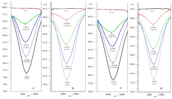 FTIR spectra were carried out at P = 100 kPa and room temperature. FTIR spectra of binary solutions at mole fractions x1 = 0.0, 0.25, 0.50, 0.75, and 1.0 was recorded using the IRAFINITY spectrometer (Schimatzu, Columbia, MD, USA), with a wavelength range of 4000–500 cm−1.