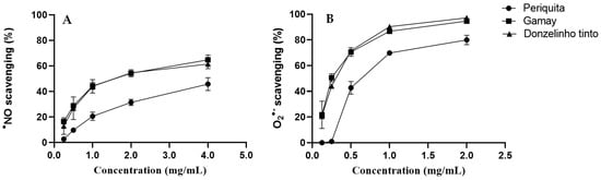 The screening of the antioxidant activity of the hydroethanolic extracts obtained from skins, seeds, and stems of Periquita, Gamay and Donzelinho Tinto grape varieties was performed using the DPPH method. The DPPH method has been widely used to determine antioxidant free radical scavenging capacity [10], providing initial information about the antioxidant potential of a compound, an extract, or other biological source [11]. So, it was conducted to identify and select those extracts with the strongest antioxidant activity for subsequent biological tests. As shown in Table 2, the seed extracts exhibited the lowest IC50 values. Therefore, they were selected for the subsequent •NO and O2•− scavenging tests.