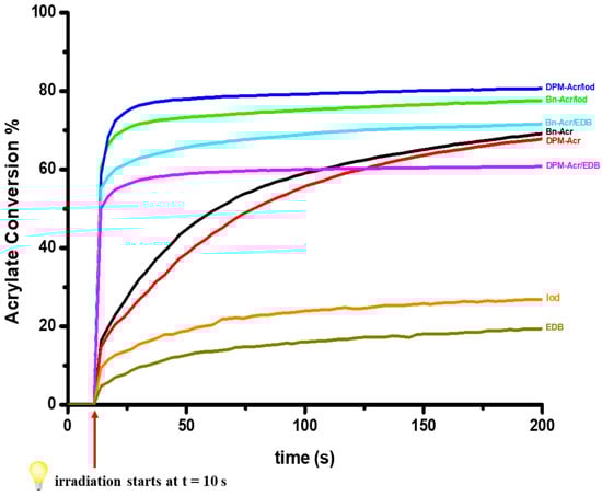 The photoinitiation abilities of acridone-based compounds in the polymerization of TA-acrylate monomer were studied using RT-FTIR in thin films (25 μm, in laminate) upon irradiation with LED@405 nm. These compounds acted as one-component Type II PIs (1% w/w) and as multicomponent PI systems in the presence of Iod as an additive (1%/1% w/w) or in the presence of EDB as an additive (1%/1% w/w). Figure 2 displays acrylate function conversion vs. irradiation duration profiles, and Table 2 provides a summary of the corresponding final acrylate function conversions (FCs).