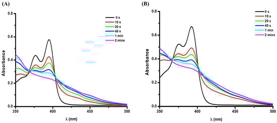 Figure 3. Photolysis of (A) Bn-Acr with Iod (10−2 M) and (B) DPM-Acr with Iod (10−2 M) in acetonitrile using LED at λ = 385 nm.
