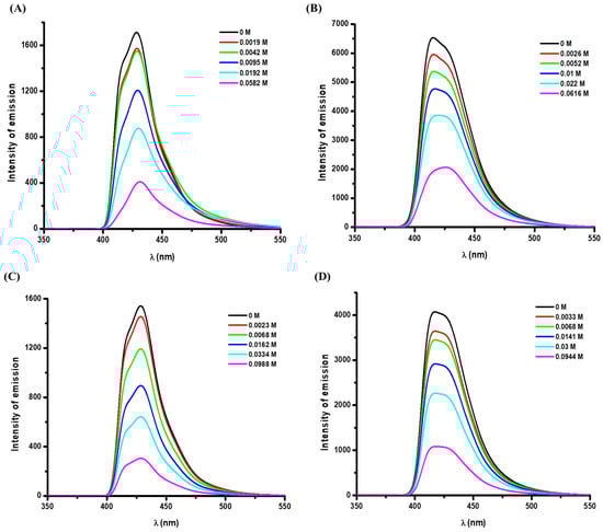 Figure 4. Fluorescence quenching study of Bn-Acr (A) and DPM-Acr (B) by Iod in acetonitrile; fluorescence quenching study of Bn-Acr (C) and DPM-Acr (D) by EDB in acetonitrile.