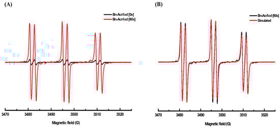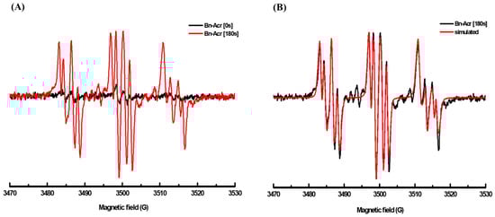 Figure 6. ESR spectra for Bn-Acr/Iod recorded in the presence of PBN and tert-butylbenzene with an LED@405nm: (A) before and after irradiation; (B) experimental and simulated spectra observed after irradiation (at t = 60 s).