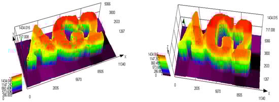 The two-component system DPM-Acr/Iod (0.1%/1% w/w) was chosen to carry out the direct laser write (DLW) tests because of its notable photoinitiation capabilities in the FRP of TA among the investigated PI systems. DLW was used to obtain the denotation “AG2” displayed in Figure 7 using a laser diode at 405 nm. Numerical optical microscopy was used to describe the denotation. Remarkably, the created 3D pattern has a high spatial resolution (polymerization process occurred only in the irradiated area), it has the following dimensions (width ≈ 11340 µm, height ≈ 5066 µm, thickness ≈ 1430 µm), and only requires 30 s of irradiation time to generate, confirming the system’s strong photosensitivity (DPM-Acr/Iod).