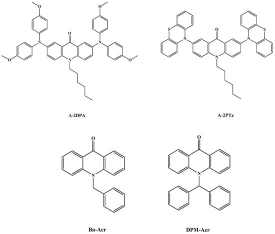 Scheme 1. Chemical structures and abbreviations of acridone derivatives: previously studied (A-2DPA, A-2PTz) in [26], and the newly investigated ones in this work (Bn-Acr and DPM-Acr).
