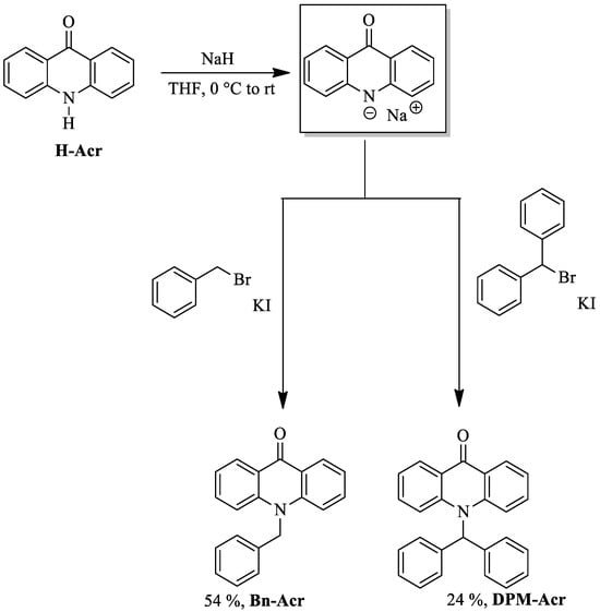 The synthetic strategy employed for the synthesis of the target PIs (Scheme 2) is based on previously reported methodologies for the N-functionalization of variously decorated acridones and step-by-step described including the characterizations within the supporting information [27]. Sodium hydride was found to be the most effective base for the deprotonation of commercially available Acr-H and the formation of the corresponding intermediate AcrNa+. The target products Bn-Acr and DPM-Acr were obtained with moderate yields after electrophilic quenching of AcrNa+ by benzyl bromide or benzhydryl bromide, respectively. Notably, to further enhance the reaction outcome, in both cases, a substoichiometric amount of potassium iodide was added to the reaction medium. This addition has proved to be beneficial to the reaction as it facilitates the transient formation of the corresponding iodide [28]. The NMR properties of the synthesized acridone compounds are as follows: Bn-Acr: 1H NMR (600 MHz, CDCl3) δ 8.61 (d, J = 8.0 Hz, 2H), 7.67–7.61 (m, 2H), 7.39–7.28 (m, 7H), 7.22 (d, J = 7.5 Hz, 2H), 5.61 (s, 1H). 13C NMR (151 MHz, CDCl3) δ 178.64, 142.97, 135.86, 134.43, 129.62, 128.19, 126.02, 123.00, 122.02, 115.55, 51.21; DPM-Acr: 1H NMR (600 MHz, CDCl3) δ 8.52 (dd, J = 8.0, 1.8 Hz, 2H), 7.43–7.38 (m, 2H), 7.38–7.30 (m, 7H), 7.29–7.27 (m, 6H), 7.24–7.17 (m, 2H). 13C NMR (151 MHz, CDCl3) δ 179.01, 143.24, 137.76, 132.93, 128.95, 128.32, 128.10, 127.46, 123.87, 121.76, 118.04, 67.58 (see more information and NMR data in the Supplementary Information).