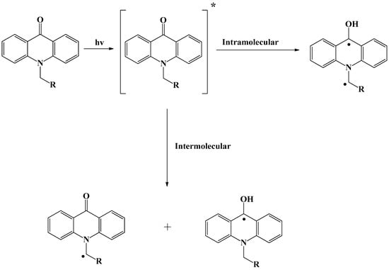 Radicals adjacent to the amine group were trapped by PBN for the Bn-Acr photolysis after 180 s of irradiation (Figure 5). Values of the hyperfine coupling constants for the detected radical adduct were αN = 13.9 G, αH1 = 1.4 G, and αH2 = 3.5 G, which could be assigned to the radicals close to the amine group (Acr-CH-R). Therefore, according to all the obtained former results and based on the literature [12,17], we can say that the ketone group in this one-component Type II initiating system was excited by light irradiation and reached an excited state. Then, the hydrogen abstraction of the amine unit in the excited molecule could proceed through intramolecular or intermolecular proton transfer reactions to produce radicals near the amine group that could start polymerization reactions, as well as ketyl radicals from the ketone group that are ineffective in starting the polymerization reactions. The details of the proposed main mechanism leading to possible initiating radicals related to acridone-based PIs acting as one-component Type II PIs are illustrated in Scheme 3.