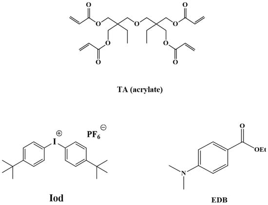 The chemical structures of the chemical compounds that were used to prepare the resin formulations are displayed in Scheme 4. These compounds were chosen with the highest purity available and used exactly as received. The monomer used (TA) was obtained from Sartomer-Europe. The storage stabilizer of the acrylate was not removed. The additives used—Bis-(4-tert-butylphenyl)iodonium hexafluorophosphate (Iod or SpeedCure 938) and ethyl-4-(dimethyl amino) benzoatewere (Omnirad EDB)—were obtained from Lambson Ltd. Wetherby, West Yorkshire, United Kingdom (UK).