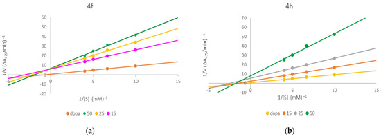 Based on the Lineweaver–Burk double reciprocal plots presented in Figure 1, the inhibition mode for these two compounds was established as mixed type inhibition. Furthermore, out of all of the investigated compounds, 4h and 4f were the only ones determined to be more active against mushroom tyrosinase than the reference inhibitor of kojic acid. However, it should be stressed that the gold standard of mushroom tyrosinase inhibition is displayed by ascorbic acid rather than kojic acid. Remarkably, all of the synthesized compounds surpassed this widely established reference as enzyme inhibitors.