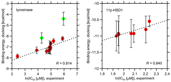 The correlation between the binding energies calculated during docking studies for a series of ligands to the two studied proteins and the experimental values of ln(IC50). The vertical bars denote the standard deviation values calculated with respect to various crystal structures of the same protein. The ligands containing the o-carborane moiety are represented by red dots whereas kojic acid and ascorbic acid by green dots. The corresponding results for carbenoxolone are not shown due to magnitude mismatch.