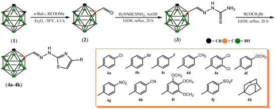 The synthesis of the title compounds was accomplished following the well-known Hantzsch cyclization reaction. In the first step, C-formyl-o-carborane (2) was obtained by means of the formylation reaction of o-carborane (1) through treatment with n-BuLi at −78 °C and the subsequent addition of methyl formate. Hydrazonecarbothioamide 3 was synthesized with 89% yield through condensation of C-formyl-o-carborane (2) with thiosemicarbazide in absolute ethyl alcohol containing a catalytic amount of glacial acetic acid. In the next step, cyclization of hydrazonecarbothioamide 3 with a variety of substituted bromoacetophenones in ethanolic solution and under reflux produced 2-(2-(1,2-dicarba-closo-dodecaboranylmethylene)hydrazinyl)thiazole 4a–4k with a high yield (60–99%). The reaction pathway is summarized in Scheme 1. All compounds were fully characterized spectroscopically using 1H, 13C, and 11B NMR and ESI-HRMS analysis. The 1H NMR spectrum of hydrazonecarbothioamide (3) showed three characteristic peaks derived from NH2 and NH groups at 8.08, 8.49, and 11.58 ppm, respectively. Carborane–thiazoles showed characteristic singlets derived from the CH group of the o-carborane moiety at 5.35–5.45 ppm and from the NH proton at about 12.17–12.60 ppm, whereas in the 13C NMR spectrum, we observe characteristic peaks at about 101–109 ppm and at about 170 ppm derived from C=N group.