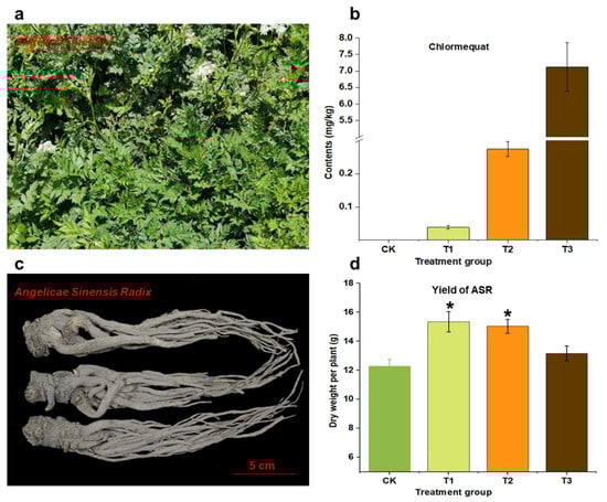 The plant morphology aerial part of Angelica sinensis (a); Angelica sinensis radix (b); CCC residue in ASR (c); and the yield of ASR (d). The asterisk represents a statistically significant difference (p < 0.05). CK denotes the control group, while T1, T2, and T3 represent CCC concentrations of 0.1 g/L, 1.0 g/L, and 10.0 g/L, respectively.
