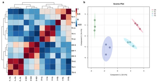 Correlation heatmap (a) and scores plot of sPLS-DA (b) for different group samples. Red represents a higher correlation; blue represents a negative correlation.