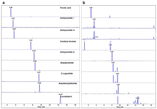Stock solutions of coniferyl ferulate, ferulic acid, ethyl ferulate, levistilide A, Z-ligustilide, butyldenphthalide, senkyunolide I, senkyunolide A, columbianadin, butylphathlide, and senkyunolide H were individually prepared at a concentration of 0.1 mg/mL in methanol. These stock solutions of standards were subsequently diluted using a mixed solvent of methanol and water (70:30, v/v) to create mixed standard working solutions. All prepared solutions were stored in a refrigerator at 4 °C until analysis. Six different concentrations of mixed standard were analyzed, and calibration curves were generated by plotting the peak area against the concentration of the target analytes.