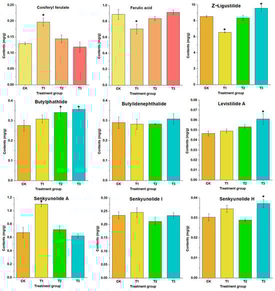 The contents of nine compounds in ASR from different groups. The asterisk represents a statistically significant difference (p < 0.05). Nine target compounds including coniferyl ferulate, ferulic acid, ethyl ferulate, levistilide A, Z-ligustilide, butyldenphthalide, senkyunolide I, senkyunolide A, columbianadin, butylphathlide, and senkyunolide H.
