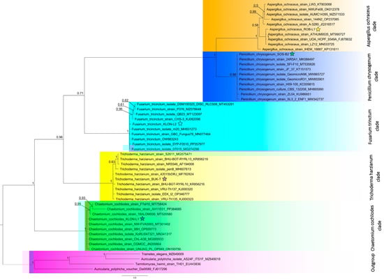 Bayesian phylogenetic tree of the ITS sequences of the five fungal isolates and sequences from NCBI. Numbers along the nodes are the posterior probabilities of the nodes. All distinct clades are shaded with different colors and separately described and all samples analyzed in this study are marked with a star.