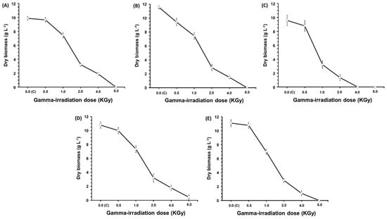 Effect of gamma irradiation of fungal growth of Trichoderma harzianum BUK-T (A), Aspergillus ochraceus ROB−L1 (B), Chaetomium cochliodes KLON−L1 (C), Fusarium tricinctum KLON−L2 (D), and Penicillium chrysogenum SOS−B2 (E).