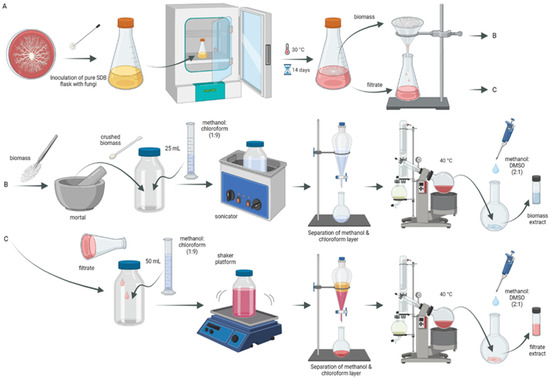 Schematic representation of the process of preparation of fungal extracts. (A) Cultivation of endophytic fungi and separation biomass from filtrate. (B) Biomass extract preparation by crushing, sonication, extraction, and concentration. (C) Filtrate extract preparation by shaking with solvents, extraction, and concentration. Created in BioRender.