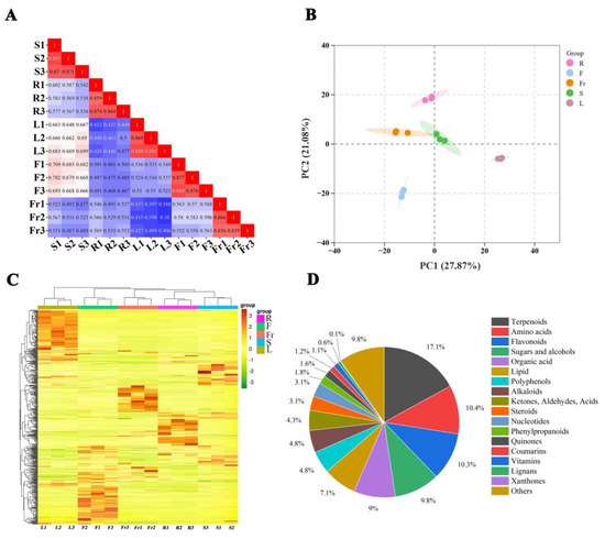 PCA and metabolite accumulation of different organs of C. luteoflora. (A) Correlation plot between samples; (B) PCA score plot of all samples; (C) cluster heat map of metabolites; (D) classification of metabolites.