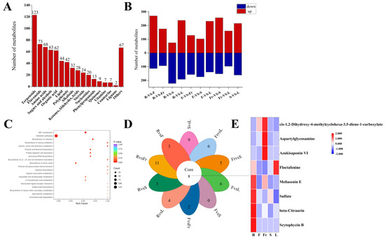 Analysis of DEMs in five organs of C. luteoflora. (A) The number of different types of DEMs in five organs; (B) the number of up-regulated and down-regulated DEMs between R, F, Fr, S, and L, and the red column represents the up-regulated DEMs; blue column represents down-regulated DEMs; (C) the top 20 KEGG metabolic pathways of DEMs were significantly enriched; (D) petal diagram of DEMs; (E) the heat map of common metabolites.