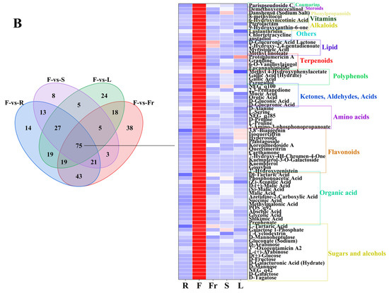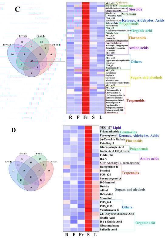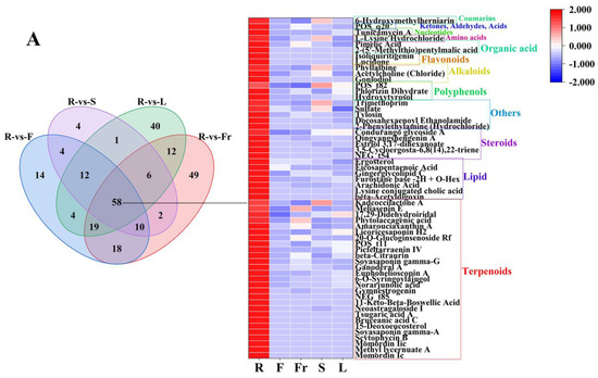 The dominant DEMs of R, F, Fr, S, and L were classified by the HMDB database. According to the classification diagram of dominant DEMs, the dominant DEMs of R were 27 terpenoids (Momordin Ic, Gymnestrogenin, Momordin Iic, Ganoderal A, beta-Citraurin, etc.), 7 lipids (beta-Acetyldigoxin, Ergosterol, arachidonic acid, eicosapentaenoic acid, Gingerglycolipid C, etc.), 5 steroids (3,5-Cycloergosta-6,8(14),22-triene, Estriol 3,17-dihexanoate, Qingyangshengenin A, Condurango glycoside A, Qingyangshengenin A), 5 others (2-Phenylethylamine (Hydrochloride), Docosahexaenoyl Ethanolamide, Tylosin, Sulfate, Trimethoprim), 3 polyphenols (Hydroxytyrosol, Phlorizin Dihydrate, p-Vinylphenyl O-[beta-D-apiofuranosyl-(1-6)]-beta-D-glucopyranoside), 3 alkaloids (Goniodiol, Acetylcholine (Chloride), Phyllalbine), 2 flavonoids (Lucidone, Isoliquiritigenin), 2 organic acids (2-(5′-Methylthio)pentylmalic acid, Pimelic Acid), 1 amino acid (L-Lysine Hydrochloride), 1 nucleotide (Tunicamycin A), 1 ketone, aldehyde, acid ((3-Carboxypropyl)Trimethylammonium Chloride), and 1 coumarin (6-Hydroxymethylherniarin).