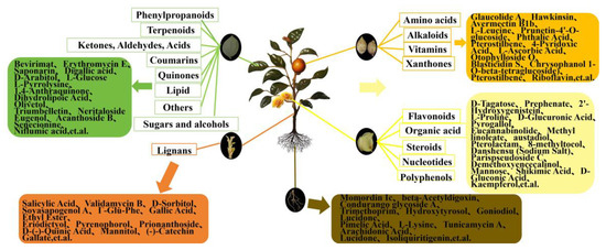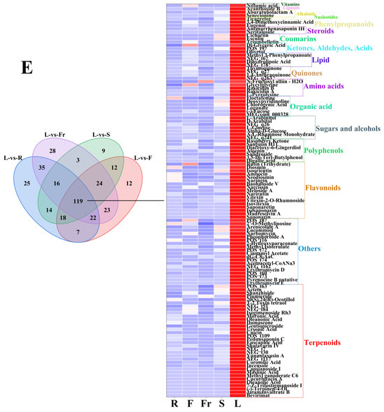 The dominant DEMs of L were 34 terpenoids (Bevirimat, Cnicin, (-)-Terpinen-4-Ol, Actein, oleanolic acid, etc.), 20 others (Erythromycin E, Pyrenocine B putative, Erythromycin D, Acetoacetyl-CoANa3, dG-C8-AaC, etc.), 17 flavonoids (Saponarin, Narirutin, Naringin, Diosmin, Isovitexin, etc.), 7 polyphenols (Digallic acid, Raspberry Ketone, Salidroside, Aloenin, Diacetoxy-6-Gingerdiol, etc.), 7 sugars and alcohols (D-Arabitol, A-L-Rhamnose Monohydrate, Alpha-D-Glucose, L-Glucose, L-Arabinitol, etc.), 6 organic acids Floctafenine, MEGxm0_000328, Loganate, Chlorogenic Acid, etc.), 5 amino acids (L-Pyrrolysine, Rakicidin A, Rakicidin B, Glycylglycine, N-Fructosyl alliin—H2O), 4 quinones(Physcion 8-O-Β-D-Glucopyranoside, 1,4-Anthraquinone, 2-Tert-Butyl-1,4-Benzoquinone, Thymoquinone), 4 lipids (PG(18:3(9Z,12Z,15Z)/20:3(8Z,11Z,14Z)), Dihydrolipoic Acid, NCGC00380204-01_C26H38O6_Androsta-11,15-diene-14-carboxylic acid, 3,15,19-trihydroxy-4,4,8,12,16-pentamethyl-17-oxo-, methyl ester, Methyl 3-Phenylpropanoate), 3 ketones, aldehydes, acids (Olivetol, NCGC00380966-01_C12H16O4_6H-2-Benzopyran-6-one, 1,7,8,8a-tetrahydro-7,8-dihydroxy-3,5,7-trimethyl-, (7S,8S,8aS)-, Dl-Glyceric Acid), 3 coumarins (Triumbelletin, Esculin, Cichoriin), 2 steroids (Neritaloside, Anemarrhenasaponin III,), 2 phenylpropanoids (Eugenol, 3,4-Dimethoxycinnamic Acid), 2 alkaloids (Senecionine, Aburatubolactam A), 1 vitamin (Niflumic acid), and 1 nucleotide (Ticagrelor), and 1 lignan (Acanthoside B) (see Figure 4).