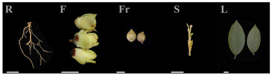 Root (R), stem (S), leaf (L), and flower (F) tissues of C. luteoflora were collected from the China Rare Species C. luteoflora Reserve in Chishui City, Guizhou Province (longitude: 106°03′ E, latitude: 28°23′ N, 497 m), on November 2023, from 6 eight-year-old plants with good growth that were free of pests and disease; the fruit (Fr) was collected in December 2023 (Figure 5). The authority responsible for the C. luteoflora resources is the Management Bureau of Chishui Alsophila Spinulosa National Nature Reserve in Guizhou Province, China, who provided permission to collect the C. luteoflora samples. A hoe was used to randomly excavate underground roots, and the soil on the roots was washed with mineral water. Half of the opened flowers, fruits to be cracked, and semi-lignified stems and leaves from the current year were collected. The samples were quickly placed in liquid nitrogen for quick freezing, with 3 biological replicates for each sample, and stored at −80 ℃ for backup.