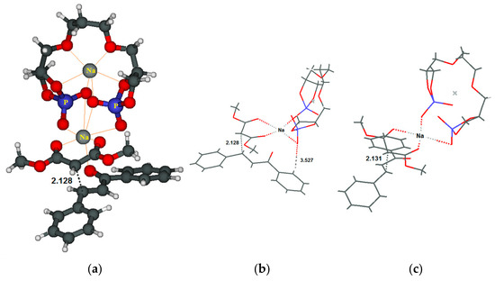 In an attempt to rationalize the experimental outcomes, we performed a computational study on the reaction with chalcone 5a (see Supplementary Materials for details on the method and a more extended discussion). In the structure of the transition state (TS(R)) for the nucleophilic addition yielding the R product (Figure 3a), the catalyst is depicted on the upper part of the figure; the upper sodium cation is fully solvated by the oxygen atoms (in red) of the catalyst, while the second, on the lower part, interacts also with the oxygen atoms of the malonate (in the middle) and the chalcone (in the lower part).