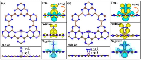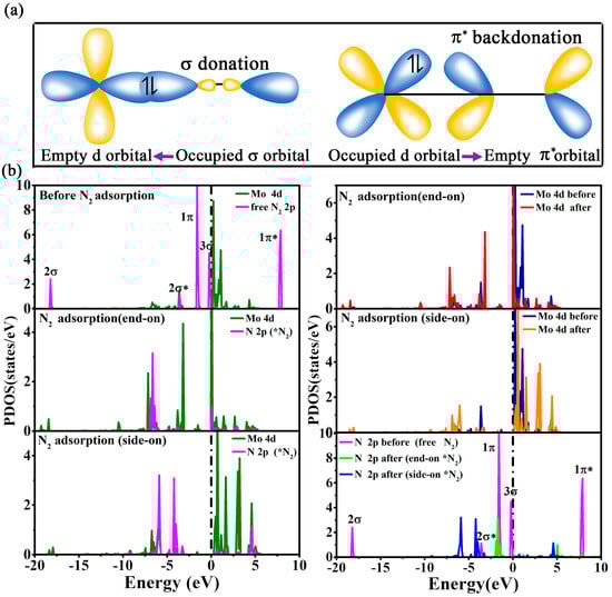Moreover, the charge density differences for end-on and side-on N2 adsorption configurations were further calculated to better understand N2 activation, as presented on the right side of Figure 2a,b, respectively. The significant charge redistribution between the embedded Mo atom and N2 molecule was observed for both adsorption patterns. The Bader charge analysis reveals that about 0.33 e− and 0.59 e− are fed back to N2 with end-on and side-on patterns, respectively, signifying that side-on mode exhibits the stronger N2 activation ability.